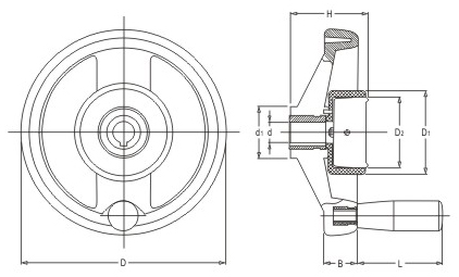 JS.105006 雙輻表盤手輪 顏色:黑色 材質:酚醛樹脂(膠木)、鋁合金 用途:適用于木工、食品、包裝、印刷等機械的精密指示或讀數調節 特性:外形美觀、堅固耐用、機械式結構、