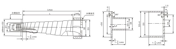 D1-shield's small end inside Diameter=dmaz+10mm D2-shield's large end inside diameter D3-Iargeflangl inside diameter=D2+6~8mm D4-small fiange outside diameter=D1-1~2mm dmax-Max,diameter of the parts tobe shieeded Lmin-Min,compression length Lmax-Max extension length L-allowable max.travel raugl